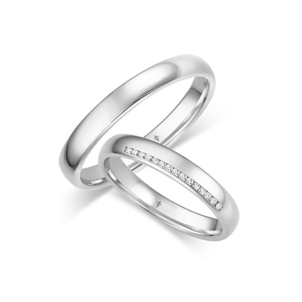 Schlichte Trauringe mit einem Steinbesatz von 15 Brillanten mit gesamt 0,08 ct in der Qualität w/if die in einer Reihe angeordnet sind. Die polierte Oberfläche macht diesen schmalen Trauring zu einem Ring fürs Leben.