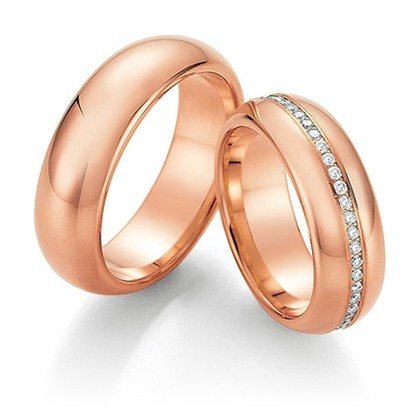 Edle Ringe mit prägnanten Formen. Diese beiden rotgoldenen Ringe sind etwas stärker gewölbt und passen sich gut an die Finger an. Die 0,48ct Brillanten verwandeln den Damenring dabei in eine Reizexplosion die nicht übersehen werden kann.