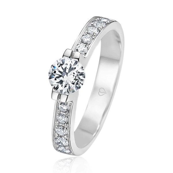 Der Verlobungsring Dedicated im glanzvollen Design ist in der Mitte geschmückt von einem 0,50 ct Diamanten im Brillantschliff der durch eine gradlinige, polierte 4-er Krappenfassung getragen wird. Gesamt sind auf diesem Antragsring 0,75 ct Brillanten verarbeitet.